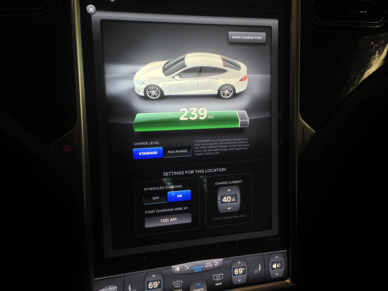 Scheduled charging. My car is configured to being charging at 1am when it’s plugged in at home. ← Previous Next → Scheduled charging. My car is configured to being charging at 1am when it’s plugged in at home.